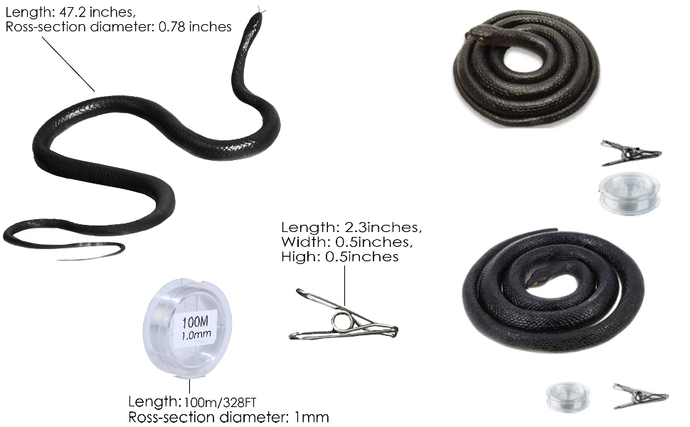 - đ Easy Assembly: Along with the fake snake, the set includes a two-meter roll of transparent string (section diameter: 1mm) and a metal clip. This allows you to effortlessly assemble a snake prank by attaching the string to the clip, eliminating any complicated steps. With this simple setup, you can easily create a terrifying effect.